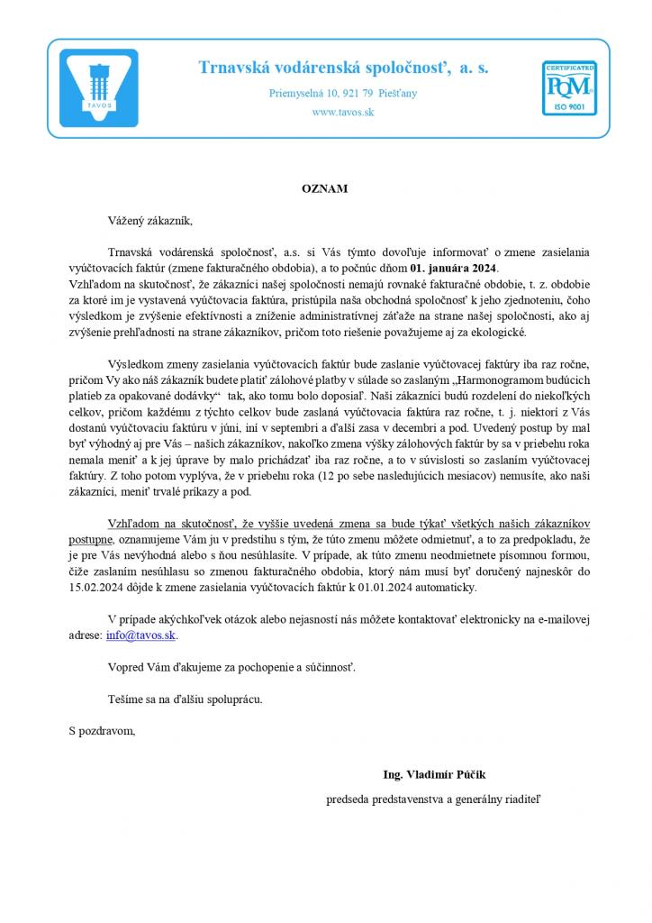 TAVOS, a.s. oznamuje občanom zmenu fakturačného obdobia. Podrobnejšie informácie nájdete v priloženom ozname.