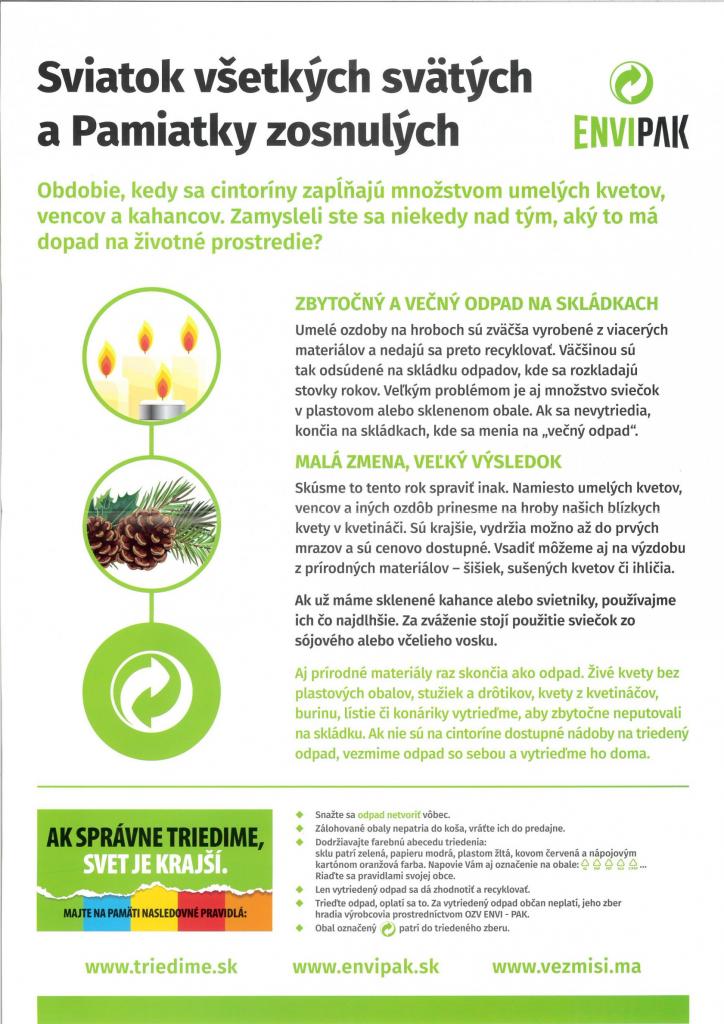 Žiadame občanov, aby odpad triedili správne podľa týchto pokynov, inak nám zberová spoločnosť nebude môcť odpad odobrať ako triedené zložky. Žiadame tiež, aby ste pri nakupovaní dekorácií volili prírodné materiály, ľahko rozložiteľné v prírode. Ďakujeme za pochopenie a ochranu životného prostredia.