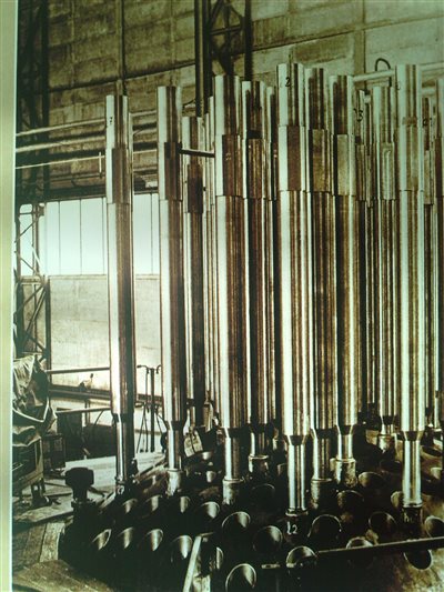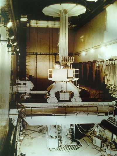 Popis k foto: "Do šachty putuje oceľová nádoba reaktora". In DOBÁK, Dobroslav et al. Atómové elektrárne Bohunice Premeny. Banská Bystrica: Slovenské elektrárne s. r. o., b. r., b. s. |