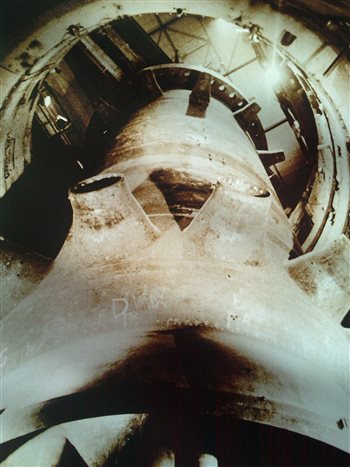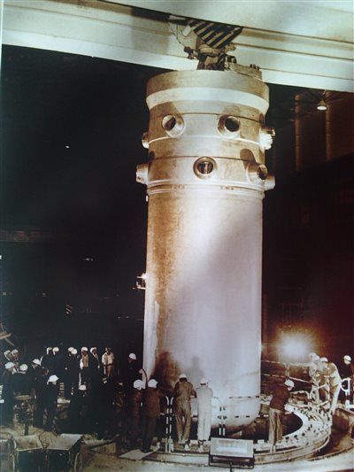 Popis k foto: „Tlaková nádoba nad šachtou reaktora“. In DOBÁK, Dobroslav et al. Atómové elektrárne Bohunice Premeny. Banská Bystrica: Slovenské elektrárne s. r. o., b. r., b. s. |