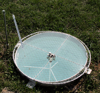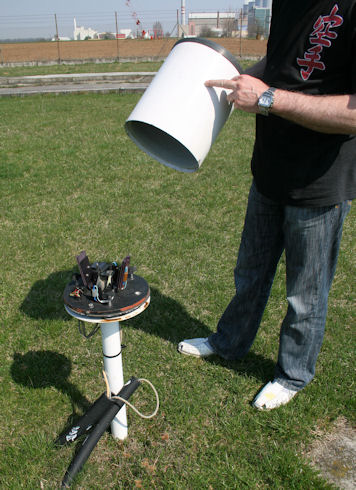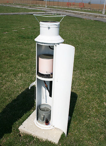 Áno, vyžaduje si pravidelnú údržbu. Musíme kosiť trávu, aby mohli prístroje spoľahlivo merať. Tu ( ďalekohľad na skrinke – pozn. red.) máme ďalekohľad, ktorým pozeráme na stožiar, či sú čidlá prístrojov neporušené. No a potom je to pravidelná údržba prístrojov (sú nerezové – pozn. red.), dolievanie do niektorých vody (kde sa sleduje odparovanie – pozn. red.), udržiavanie miesta na meranie pôdnej teploty bez porastu, nastavovanie, výmena niektorých častí, dopĺňanie atramentu do zapisovačov, pravidelné obchôdzky. Niekoľko metrov od stožiara je bunka, ktorú tu postavili Rakúšania. Majú tam svoje meracie zariadenia. Do nej nemáme prístup. V pravidelných intervaloch chodia vymieňať filtre. ( Na foto vľavo je zariadenie na sledovanie výparu z vodnej hladiny).