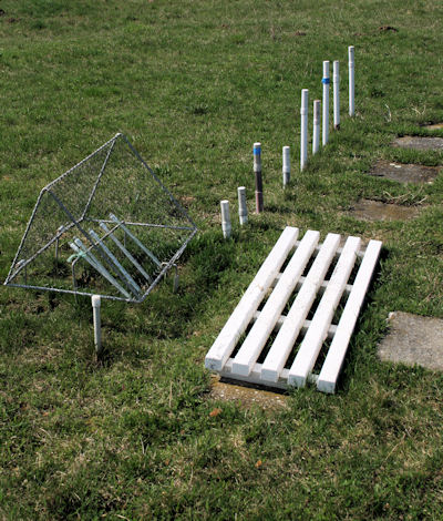 Meranie pôdnej teploty na ploche s porastom. Posledný merač vpravo hore meria teplotu pôdy v 10 metroch hĺbky. Plavákový zrážkomer