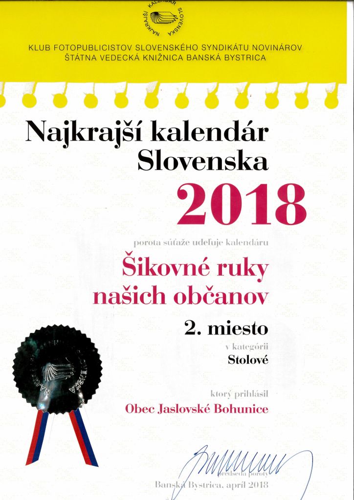 Obec sa prvýkrát zapojila do súťaže o Najkrajší kalendár. Prihlášku sme našli v Obecných novinách a tak sme na skúška poslali tohoročný stolový kalendár, kde sa predstavujú naši šikovní občania vlastnoručnými výrobkami.