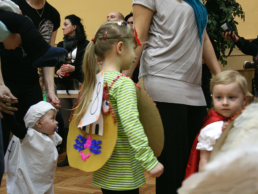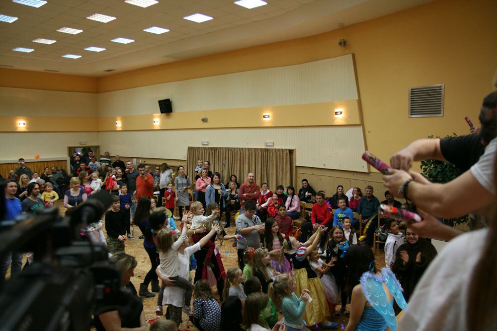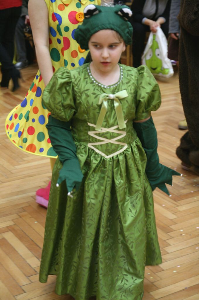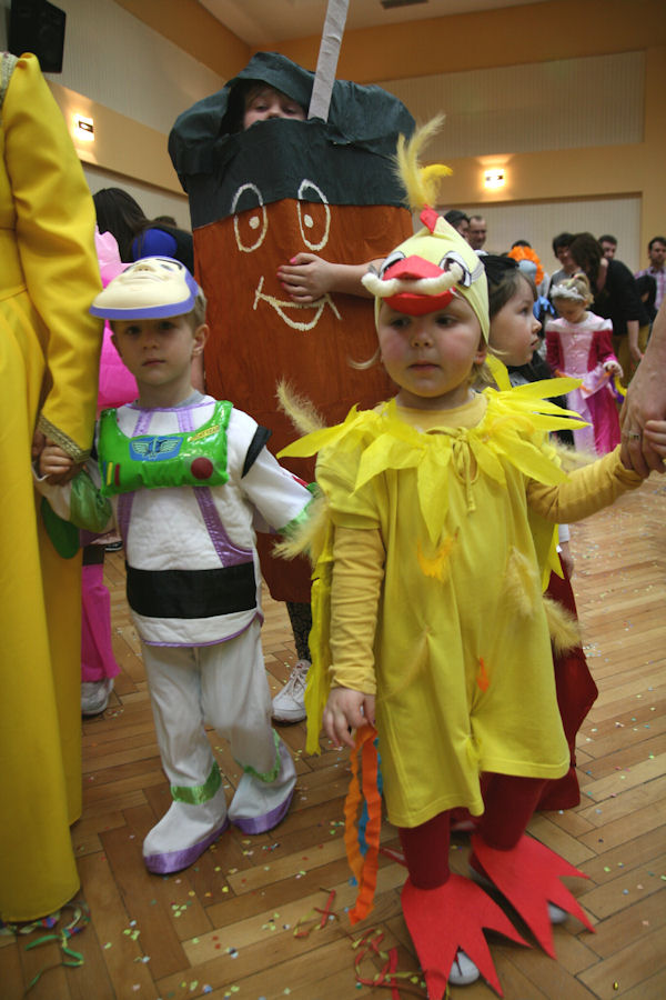 Detský maškarný ples – Vodné postavičky zastupovala len táto žabka - vodník neprišiel ani jede.