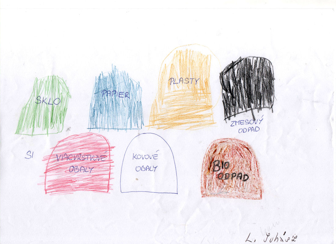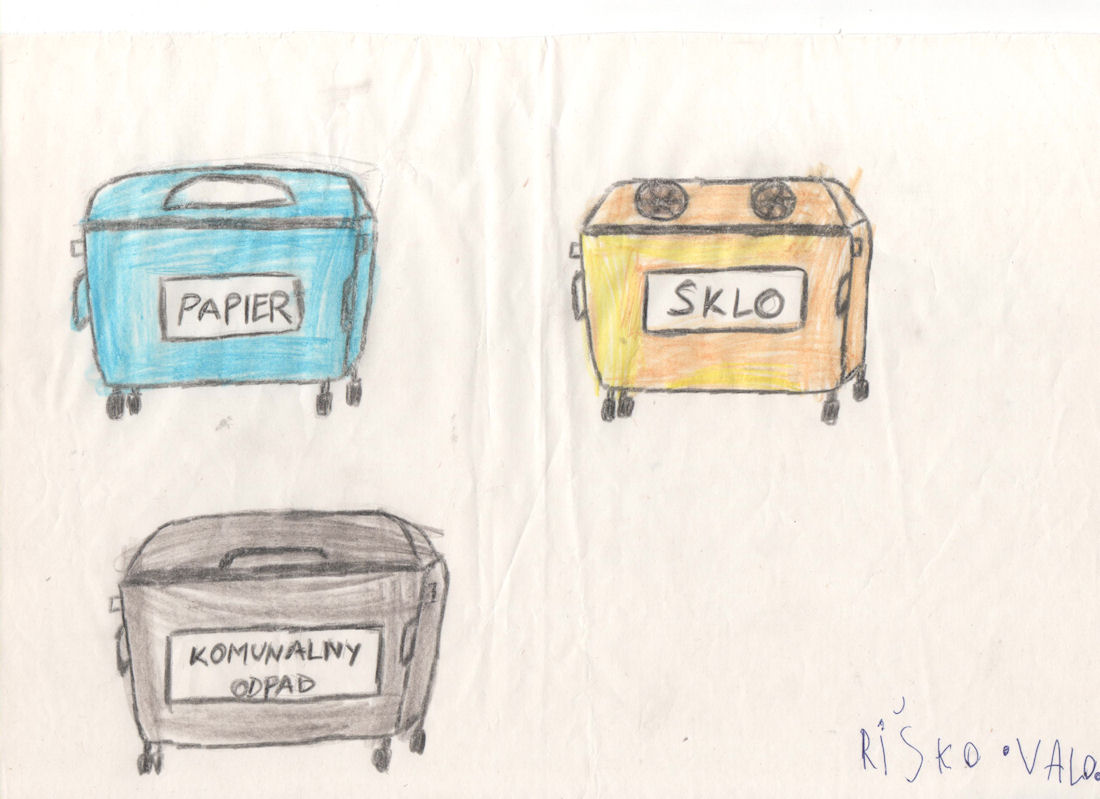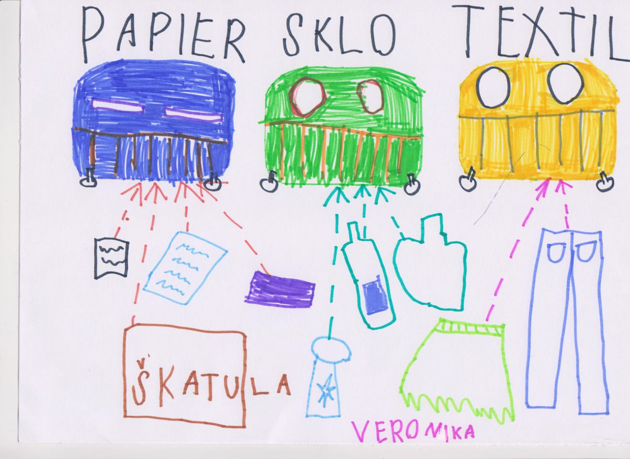 Práce detí materskej školy na tému, ako vidia separovaný zber, do akých nádob sa ukladajú jednotlivé zložky. Pretože Odpad je u nás stále veľkým problémom.
