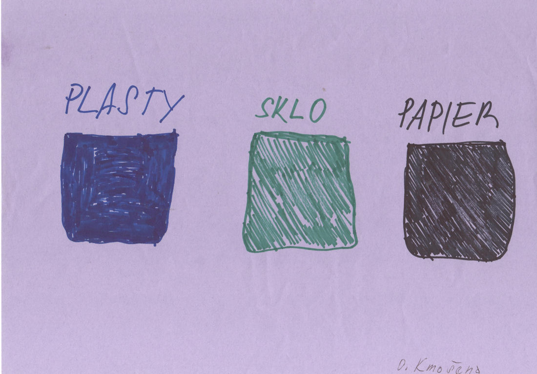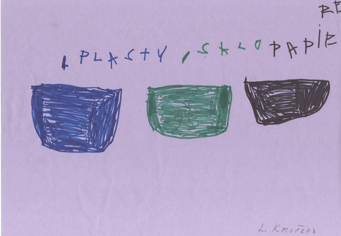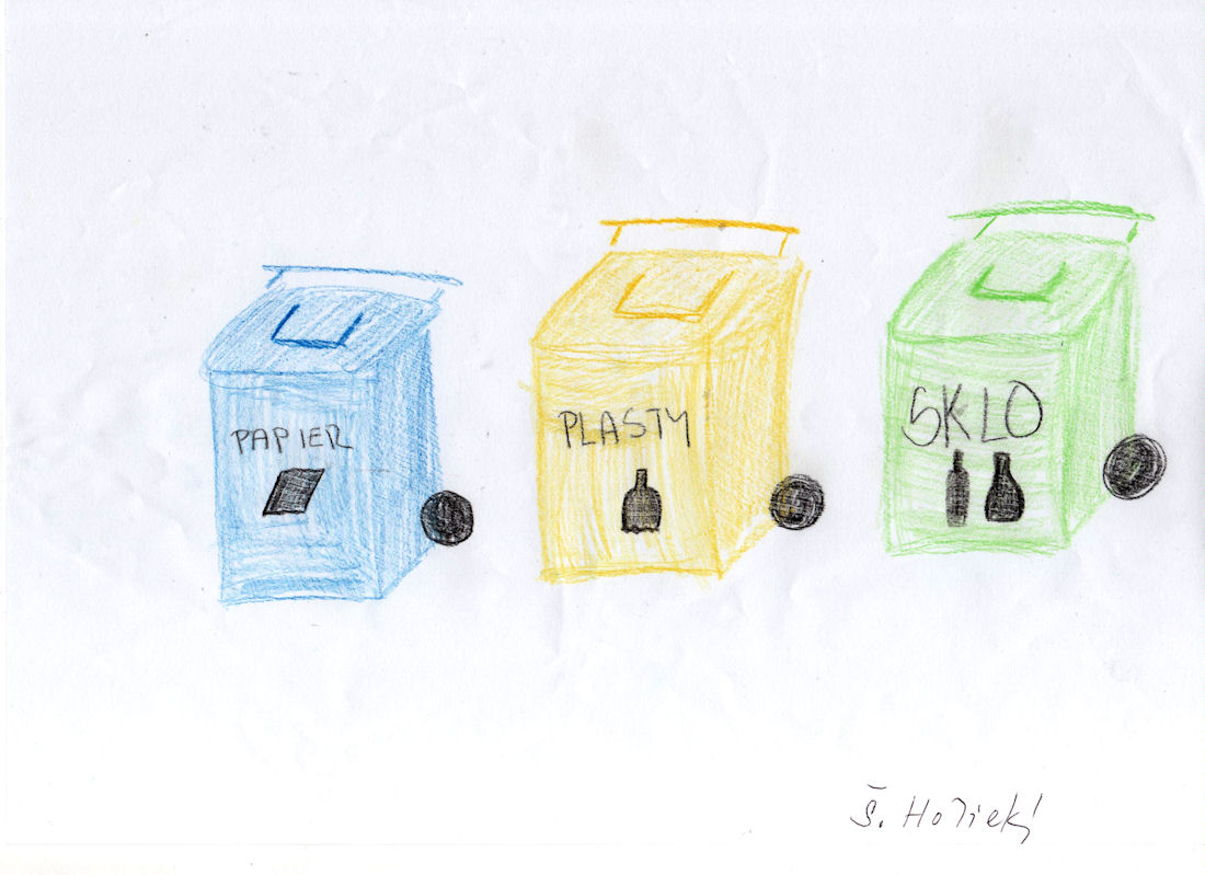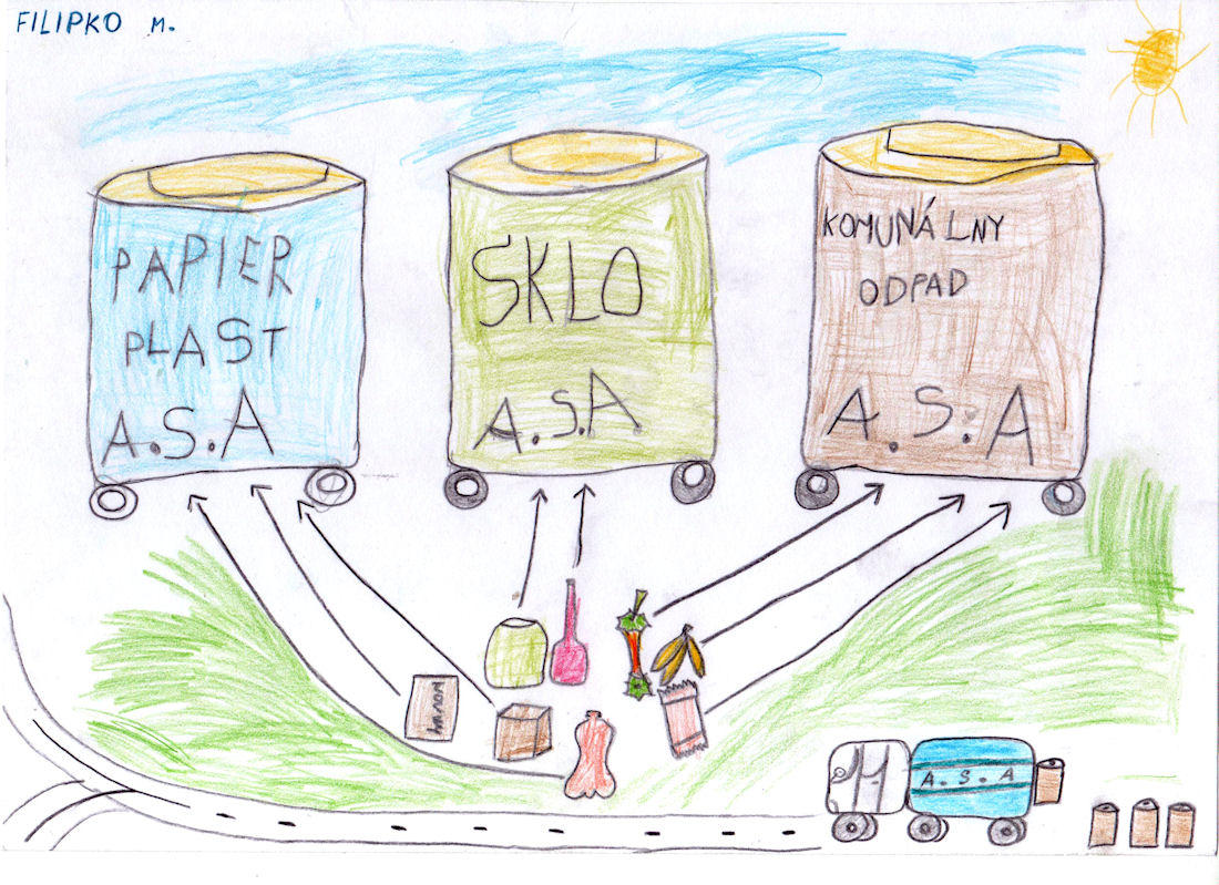 Práce detí materskej školy na tému, ako vidia separovaný zber, do akých nádob sa ukladajú jednotlivé zložky. Pretože Odpad je u nás stále veľkým problémom.