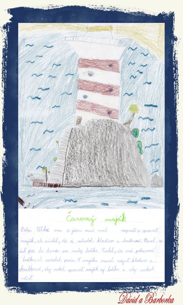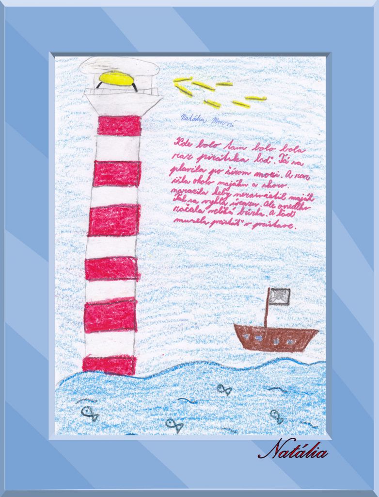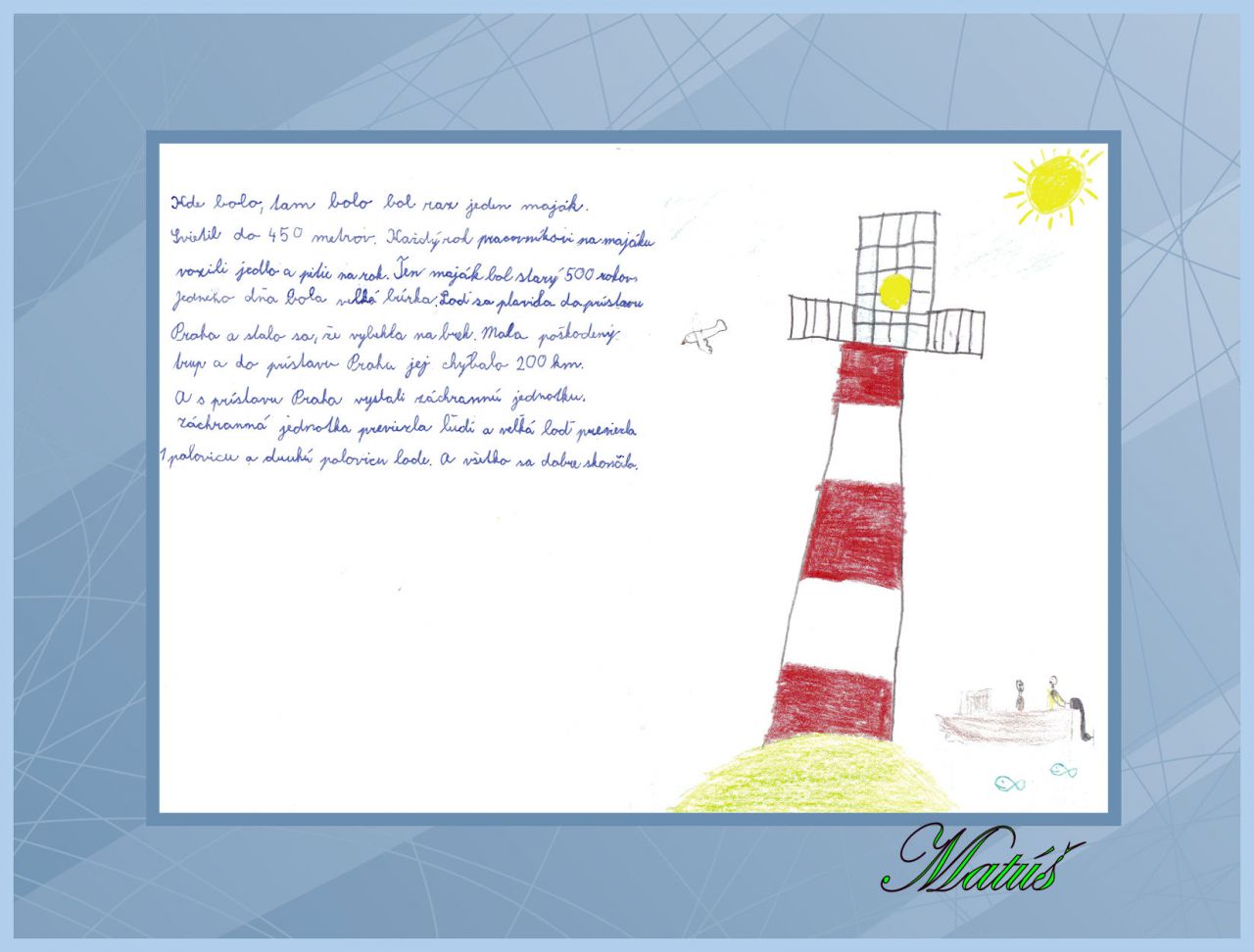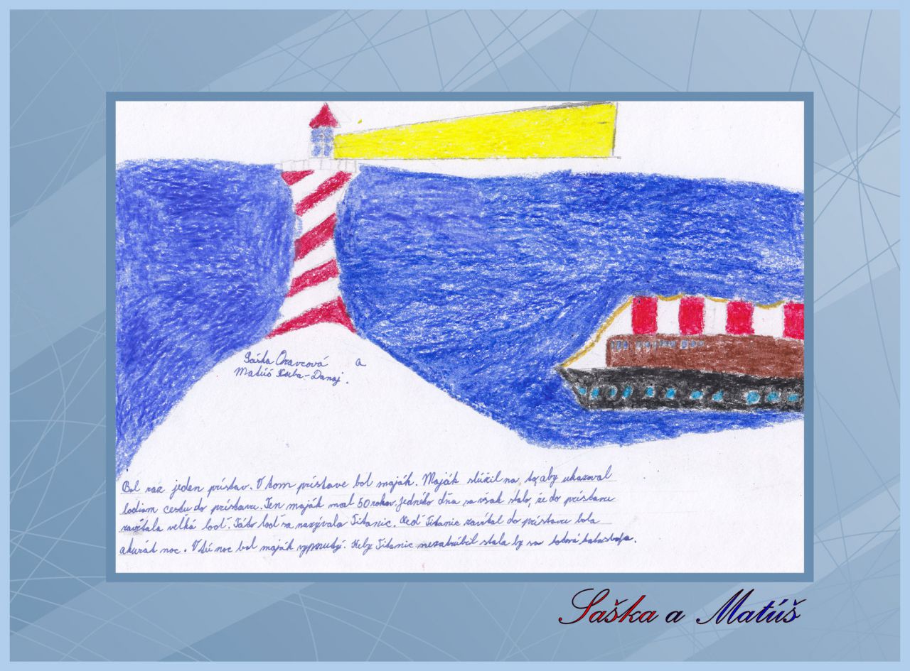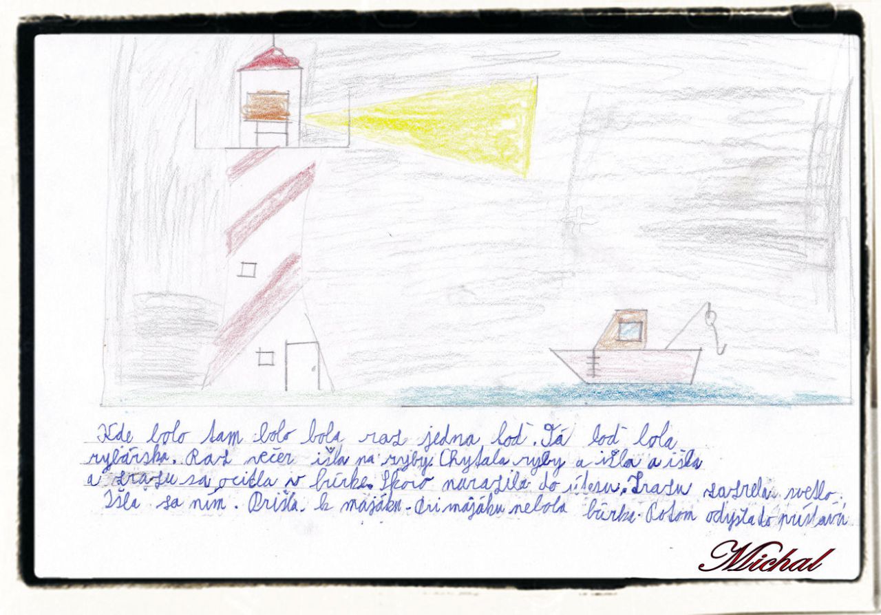 Kde bolo tam bolo bol raz jeden maják. Svietil do 450 metrov. Každý rok pracovníkovi na majáku vozili jedlo a pitie na rok. Ten maják bol starý 500 rokov. Jedného dňa bola veľká búrka. Loď sa plavila do prístavu Praha a stalo sa, že vybehla na breh. Mala poškodený trp a do prístavu Praha jej chýbalo 200 km. A z prístavu Praha vyslali záchrannú jednotku. Záchranná jednotka priviezla ľudí a veľká loď previezla 1 polovicu a druhú polovicu lode. A všetko sa dobre skončilo.