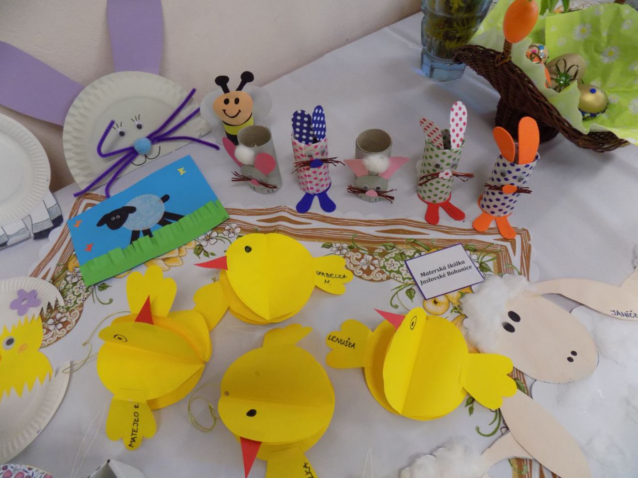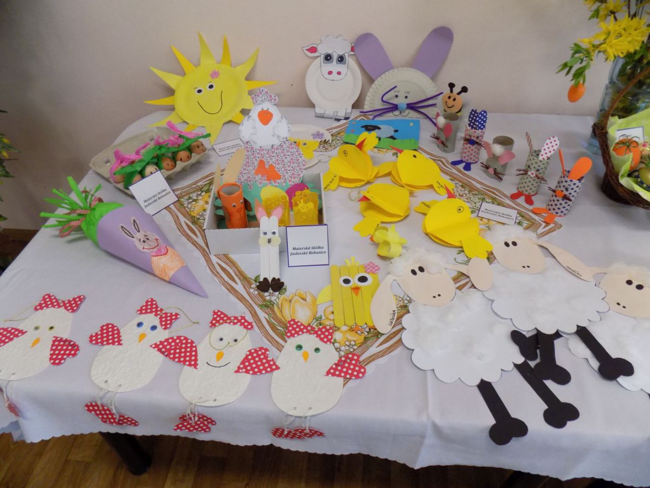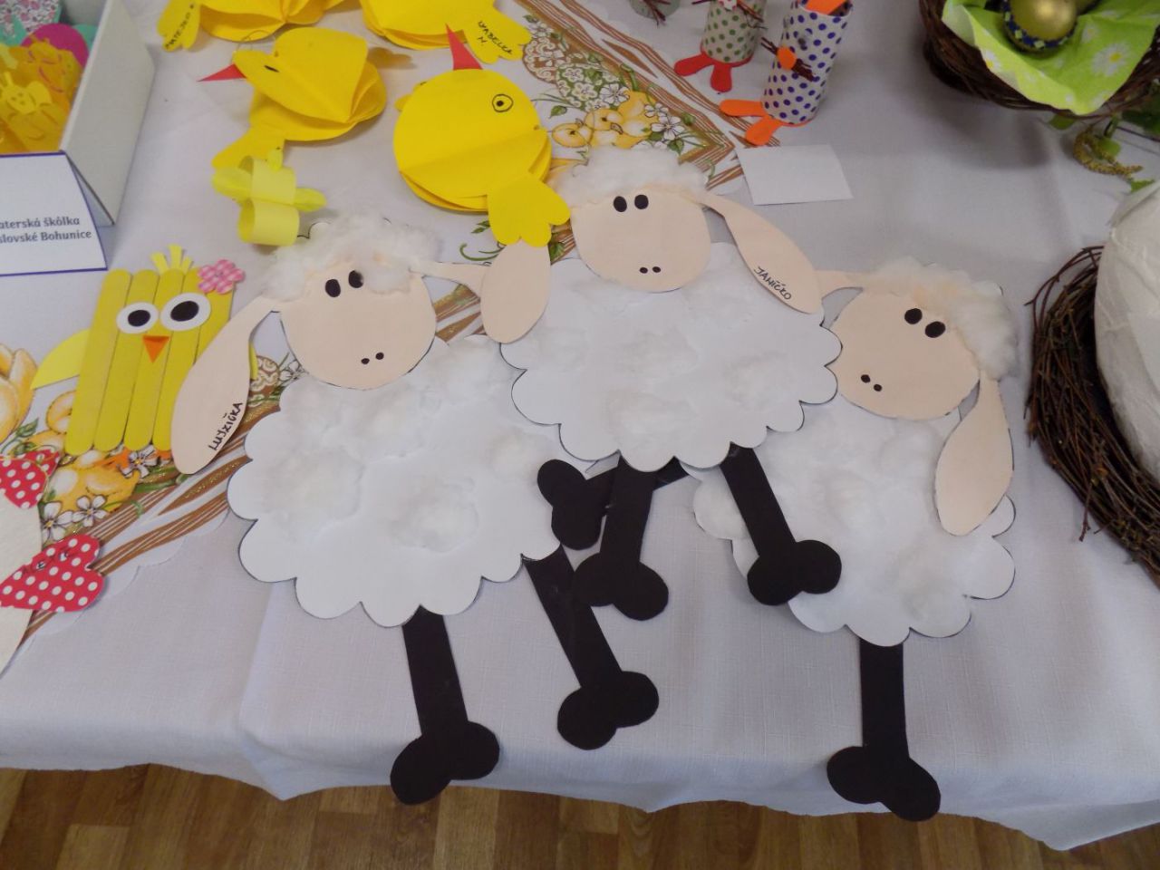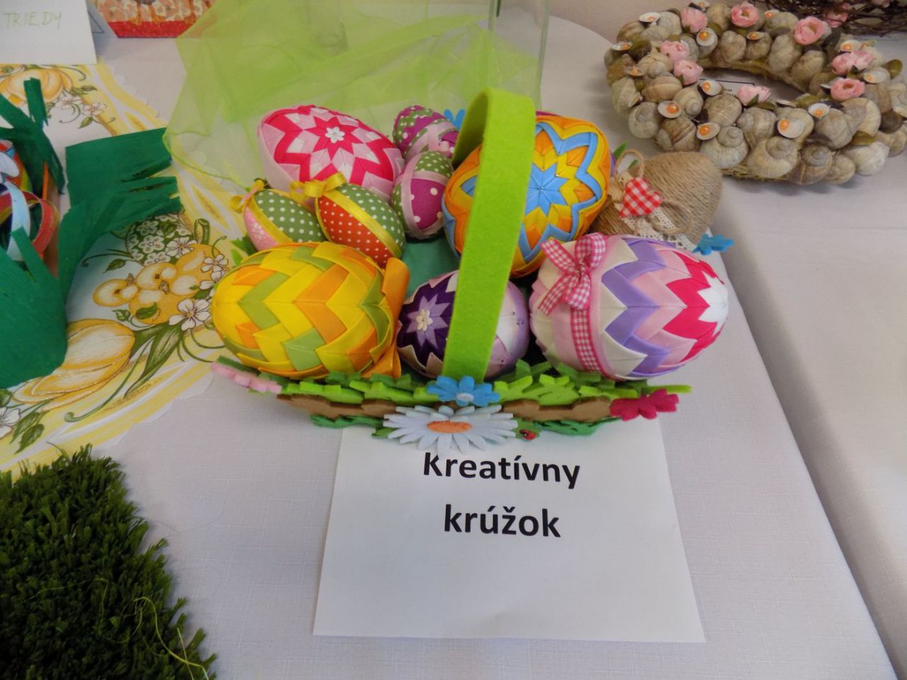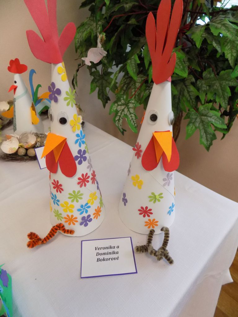 Do 6.4. nám na obecný úrad doniesli už aj hotové výrobky - tradičné kraslice, ale aj vence, z papiera, alebo látky vyrobené dekorácie. Originálne boli barančeky vyrobené z kukuričných pukancov.  Prekvapenie nás čakalo na záver - skoro 4 metrový korbáč, ktorý bol upletený z dlhých prútov, ktoré neboli nadkladané.