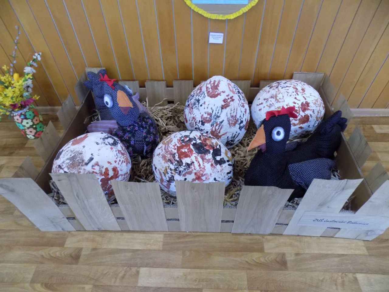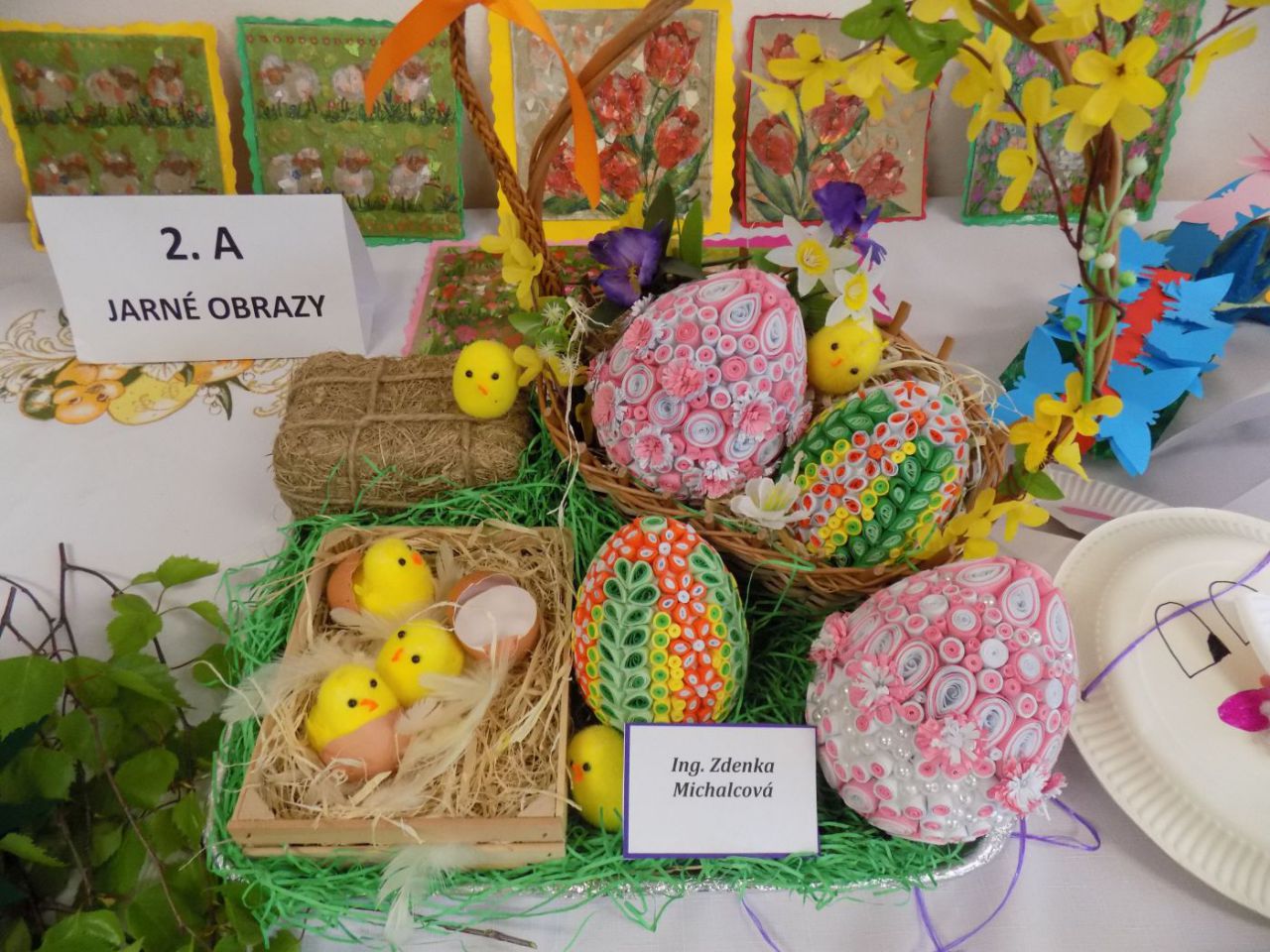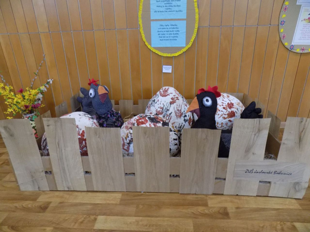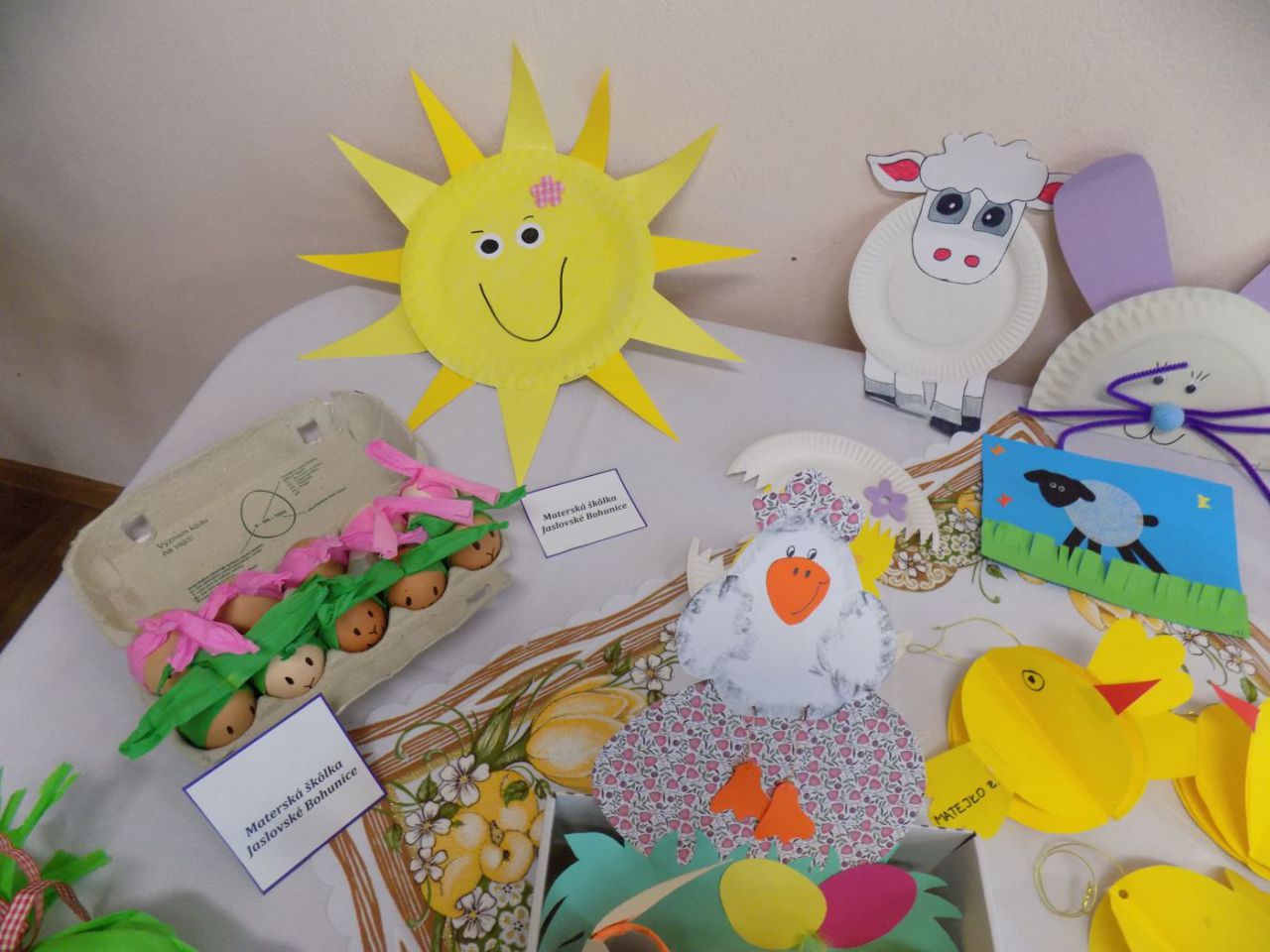 Do 6.4. nám na obecný úrad doniesli už aj hotové výrobky - tradičné kraslice, ale aj vence, z papiera, alebo látky vyrobené dekorácie. Originálne boli barančeky vyrobené z kukuričných pukancov.  Prekvapenie nás čakalo na záver - skoro 4 metrový korbáč, ktorý bol upletený z dlhých prútov, ktoré neboli nadkladané.