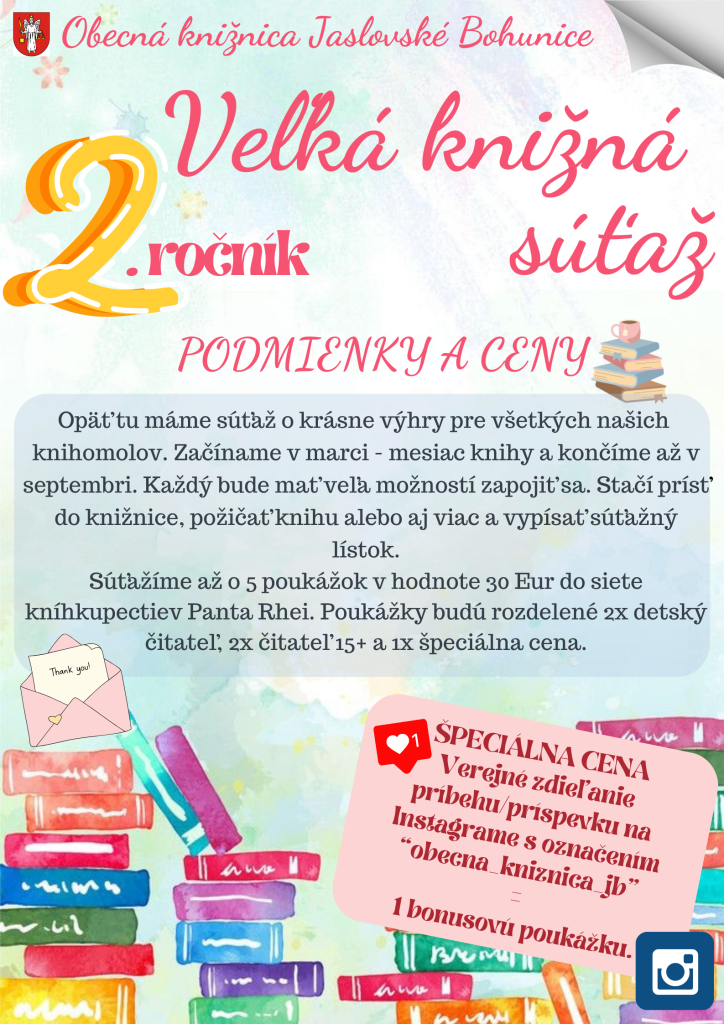 Špeciálna cena: 1 bonusová poukážka - verejné zdieľanie prípehu/príspevku na Instagrame s označením "obecna_kniznica_jb"