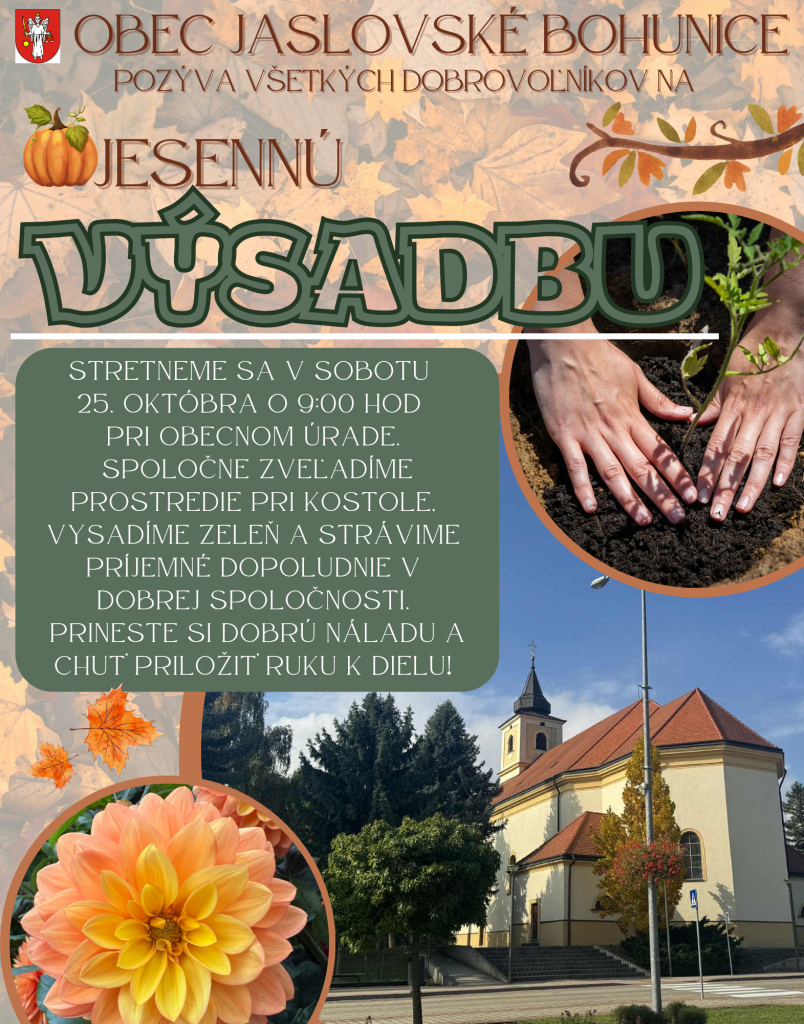 Obec Jaslovské Bohunice pozýva všetkých dobrovoľníkov na jesennú výsadbu zelene. Stretneme sa v sobotu 25. októbra o 9:00 hod. pri obecnom úrade. Pri výsadbe zelene strávime príjemné dopoludnie a priložíme ruku k dielu.