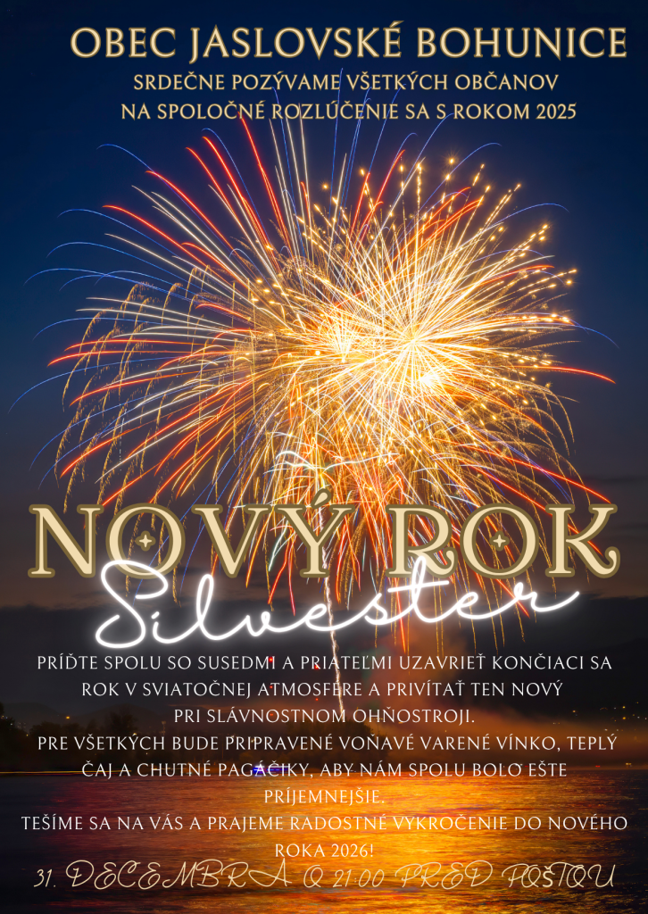 Obec Jaslovské Bohunice srdečne pozýva všetkých občanov na spoločné rozlúčenie sa so starým rokom 2025. Príďte osláviť končiaci sa rok v sviatočnej atmosfére a privítať ten nový. Čaká vás slávnostný ohňostroj a voňavé varené vínko, ktoré bude pripravené pre všetkých. Nezabudnite pozvať svojich susedov a priateľov na túto výnimočnú udalosť.