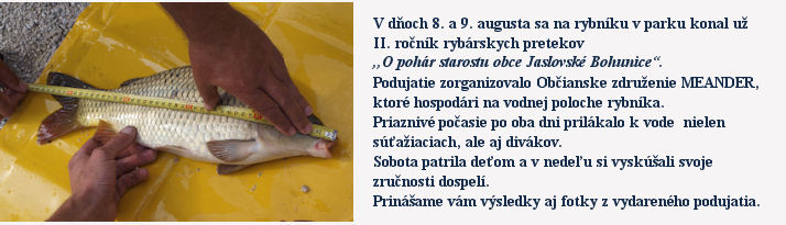 V dňoch 8.a 9. augusta sa na rybníku v parku konal už II. ročník rybárskych pretekov "O pohár starostu obce Jaslovské Bohunice". Podujatie zorganizovalo Občianske združenie MEANDER, ktoré hospodári na vodnej ploche rybníka. Priaznivé počasie po oba dni prilákalo k vode nielen súťažiacich, ale aj divákov. Sobota patrila deťom a v nedeľu si vyskúšali svoje zručnosti aj dospelí.