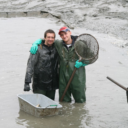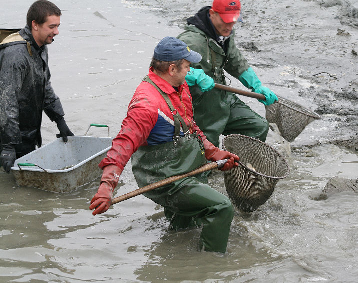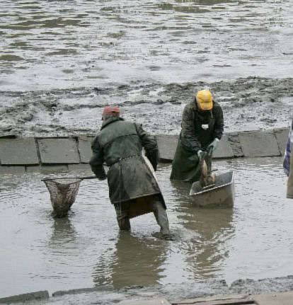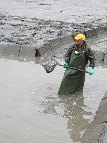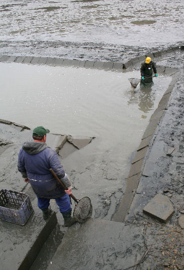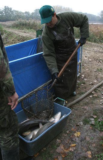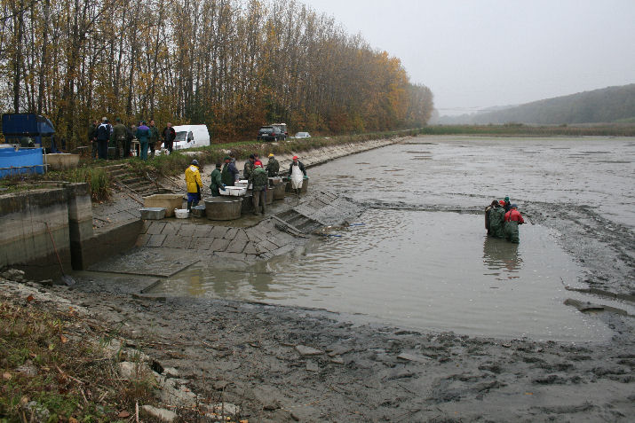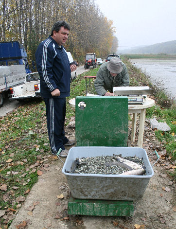 Na hrádzu umiestnili veľkú váhu a pri nej stolík. Tam bolo stanovisko pána, ktorý všetko prevažoval, zapisoval a rátal. Ľuboš Remenár šiel k nemu. V týchto miestach bol výpust popod hrádzu a cestu do kanála na druhú stranu. Pred výpustom vybudovaná vaňa bola plná špinavej vody, skorej by sa dalo povedať že riedkeho blata. Brodili sa v nej chlapi vo veľkých rybárskych čižmách. Naobliekaní, niektorí mali aj gumové rukavice, ale pri pohľade na nich mi teplo nebolo.