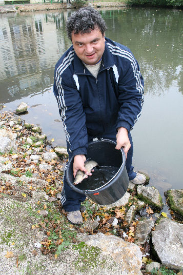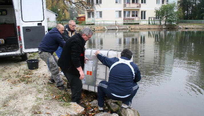 Pri rybníku sme začali ryby vykladať vedrmi. Až potom sa kaďa mohla vytiahnuť z auta a zvyšné ryby vyliať do rybníka. Neprežijú všetky. Z tých jednoročných len asi 40%. No ak prežijú, mohli by zmeniť svoju veľkosť za 3 roky na krásnych „mackov“, ktorých sme videli. Ale aj to bude úspech.