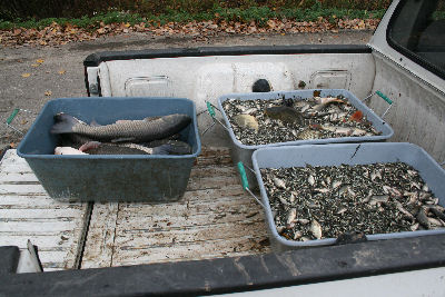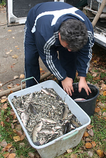 Krátke jednanie, zrátanie ceny, vyplatenie a už sa náš náklad 52,5 kg rýb niesol v nádobe k autu. Napustenie vody do kade a ryby zmenili pôsobisko. Kúpili sme 2,5 kg jednoročných amurov, 10 kg (čo je asi 15 – 20 tisíc kusov) lieňa jednoročného a 40 kg (čo je asi 2 tisíc kusov) lieňa dvoj a trojročného). Niektoré ryby mali aj 20-25 cm. Ale prevažoval drobizg veľký asi 2-3 cm. A cesta domov.