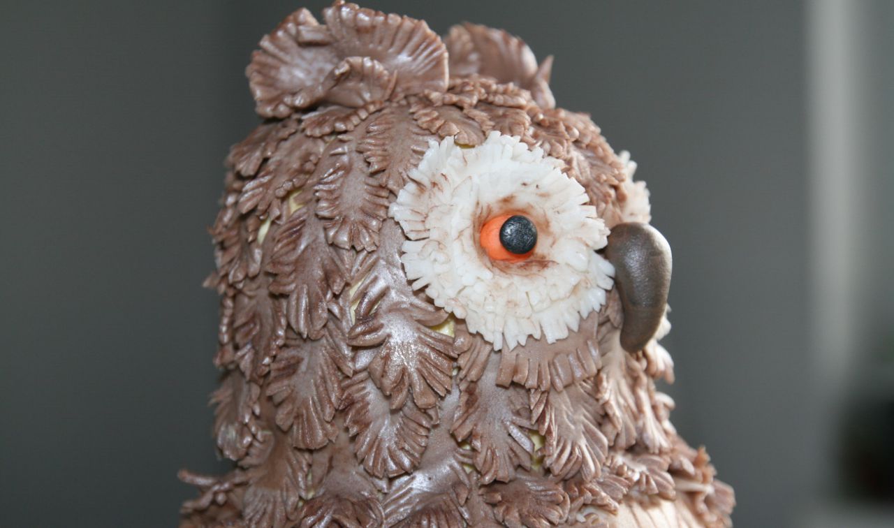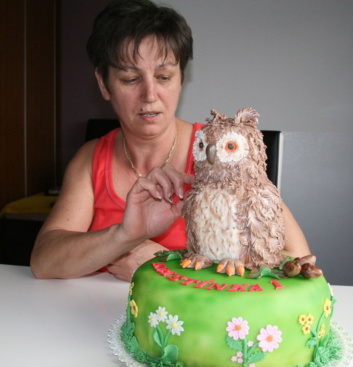 Pri našom rozhovore na stole dostávala podobu asi 20 cm sova. Na vytvarovaný korpus pribúdali pierka. Vykrajovala ich z hnedého marcipánu samostatne, na každé dokreslila kostrnku a potom manikúrovými nožničkami nastrihať nahusto okraje. Väčšie aj menšie. Piplavá robota. Biele bruško, pazúry, uši, neodmysliteľné oranžové oči. A potom osadiť na korpus. Výsledok po troch dňoch bol perfektný. Až škoda zjesť. Ale už pri tom, ako sova dostávala svoju podobu, jej hlavou vírili myšlienky na ďalšiu tortu, ktorú bude robiť. Samozrejme opäť tvar, ktorý ešte nerobila. Bol to torta v podobe kroja, ktorý sa nosil v našej dedine a bola pre jej mamu k životnému jubileu.