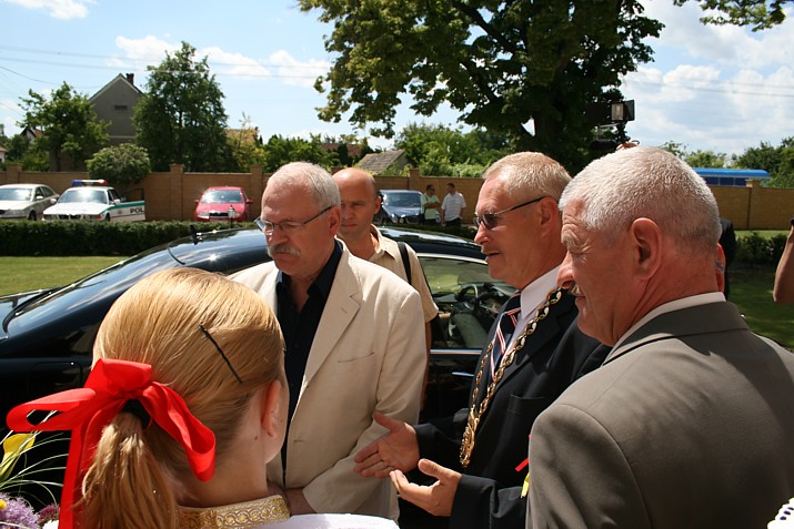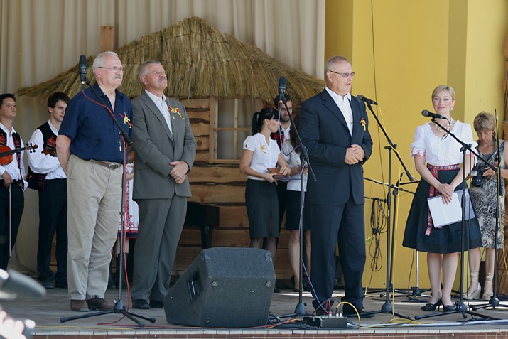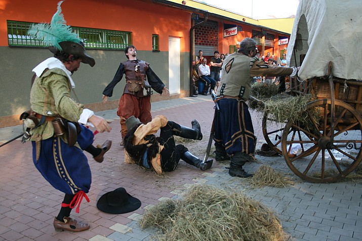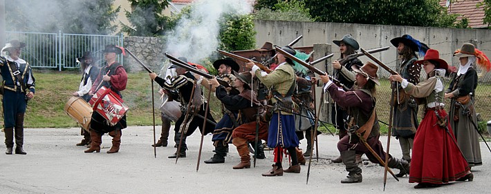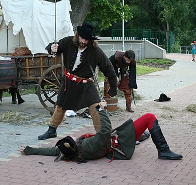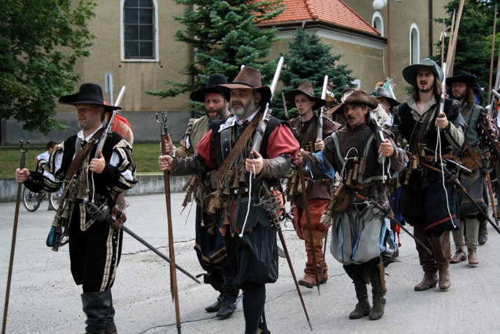 Páni a dámy, ktorých sme vám len v krátkosti predstavili, začali v piatok oslavy svojim sprievodom v dobových odevoch a na námestí pred budovou obecného úradu začali oslavy salvami z muškiet, ktoré bolo počuť asi v širokom okolí. Pokračovali cez obec do amfiteátra, kde už potom zabávali prítomných svojim naozaj profesionálne zvládnutým programom. Úspech zožali u všetkých, malých aj veľkých. Vidieť ich šermiarske umenie v dobových kostýmoch je zážitkom.