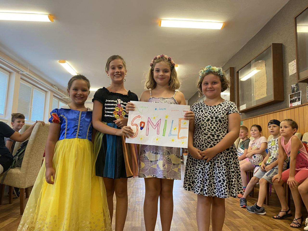 Starali sa o ne 2 animátorky. Všetko sme spoločne a s úsmevom na tvári zvládli, veď o tom je predsa tábor. Raz týždenne sme chodili na výlety. Už tradične sme navštívili nášmu srdcu blízku Trnavu, kde sme spoznávali jej detské ihriská. No a čo by to bol za výlet do Trnavy bez pizze? Veľmi sme si pochutili. Ďalší utorok sme šli, pre nás, do úplne nového prostredia. Vybrali sme sa na výlet ku Piešťanom do Rybárskeho dvora. Nové, znamená dobré, alebo sa mýlim? Nie, nemýlim. Dokonca si myslíme, že deti by návšteva Rybárskeho dvora potešila ešte raz – je to aj dobrý tip pre rodičov, ktorí rozmýšľajú, kde sa s deťmi vyberú. Obrovské ihrisko s kopou nových atrakcií, o zvieratách ani nehovorím. Ara - druh papagája, ktorý nám dal naozaj zabrať. Prekvapil nás svojim správaním a hlavne tým, ako sme sa ho nemohli ,,zbaviť”. Jedno je ale isté, na tento zážitok určite tak skoro nezabudneme. Ale tábor nebol len o výletoch. Nesmieme zabudnúť na výrobu nanukov, po ktorých sa doslova len ,,zaprášilo “. Jeden deň sme sa všetci stali cyklistami, ktorí sa vedeli nielen bicyklovať, ale sme poznali aj pravidlá cestnej premávky. Pobyt v tábore nám spríjemnil aj hasičský zbor. Jeho členovia si pre nás pripravili skvelý program. Navštívili nás aj policajti. Rozprávali nám o tom, aká je bezpečnosť veľmi dôležitá. Navštívili sme aj Smolenice, kde sme prišli za včelami. Veľa sme sa o nich dozvedeli, o ich živote a prostredí, v ktorom žijú. Povedali nám o výrobe sviečok a samozrejme že sme aj ochutnali sladučký med. Áno, to všetko sme stihli a ešte veľa ďalších zážitkov, ktoré si uchováme a budú spojené s týmto letom a táborom.