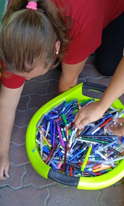 Rodičia pomáhali deťom rozoberať perá a deti triedili a hádzali perá do označených kontajnerov. Spolu sme sa učili rozoznávať materiál, z ktorého bolo pero vyrobené a oddeliť aj najmenšie časti. Zistili sme, že pero, ktoré ešte píše, sa dá ešte použiť, a preto nie je odpadom. Počas práce sme si odovzdávali skúsenosti ako doma triedime a kto z rodiny je viac zodpovedný. Najviac pier priniesla Janka Havrlentová - 897 ks, Janko Matovič - 412 ks, Patrik Strečanský - 264 ks.